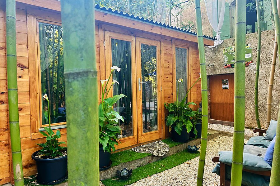 Ein gedämmtes Gartenhäuschen wird zum einzigartigen Bambus-Spa in Anduze, Frankreich