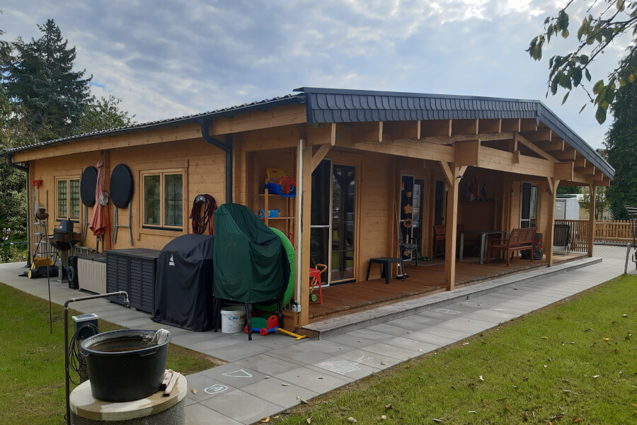 Nachdem die Kinder groß waren, dachten unsere Kunden Lothar und seine Frau Doris darüber nach, das große Einfamilienhaus zu verkaufen und in eine kleinere Immobilie zu ziehen. Die Familie prüfte verschiedene Möglichkeiten, bis sie das klassische Holzhaus RIVIERA fand, in das sie ihr ganzes Leben verlagern wollte. Auch eine passende 4x6 m große Holzgarage wurde ausgewählt, um den Bedarf an Unterstellmöglichkeiten für Fahrzeuge zu decken und zugleich eine praktische Werkstatt einzurichten. Das richtige Grundstück für den Bau des Hauses zu finden dauerte einige Jahre, aber es hat sich gelohnt, denn dieser Prozess führte sie zu einem großen, schönen Garten voller alter Obstbäume. Unser Kunde Lothar teilte uns m… (Mehr) -