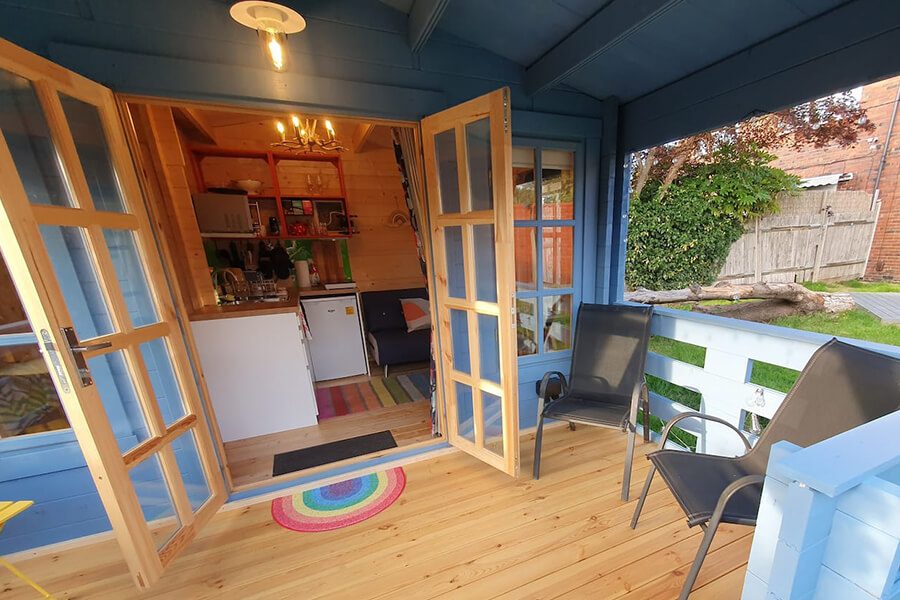 Ursprünglich sollte diese Holzhütte eine gemütliche Gartenoase für Familie und Freunde werden. Ein perfekter Ort zum Entspannen und Abschalten von der Außenwelt und natürlich um laue Sommerabende auf der herrlichen Terrasse zu verbringen und das Leben in vollen Zügen zu genießen. Die Eigentümer gingen bei der Innenfläche einen Kompromiss ein, um eine großzügige Terrasse im Freien zu haben und laut AJ war es das auf jeden Fall wert, denn sie lieben es, dort gemütlich Zeit zu verbringen. Der große überdachte Terrassenbereich ist der perfekte Ort, um eine ruhige und entspannte Atmosphäre zu genießen und alle Sorgen des Tages hinter sich zu lassen.